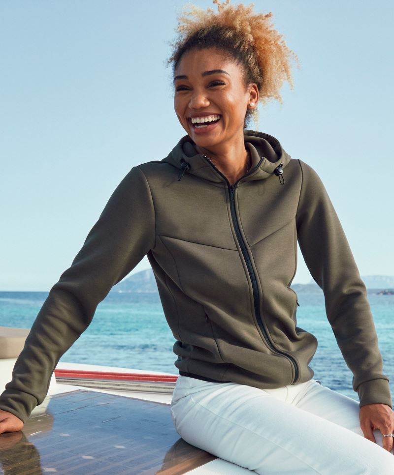 Gefütterte Kapuze mit Kordel, elastische Ärmelbündchen, 2 Seitentaschen mit Reissverschluss, doppelt gestrickt, weiches dehnbares Material, Logo-Stickerei am Kapuzenrand, UV-Schutz 50+, 40° waschbar, nicht trocknergeeignet, nicht chemisch reinigen