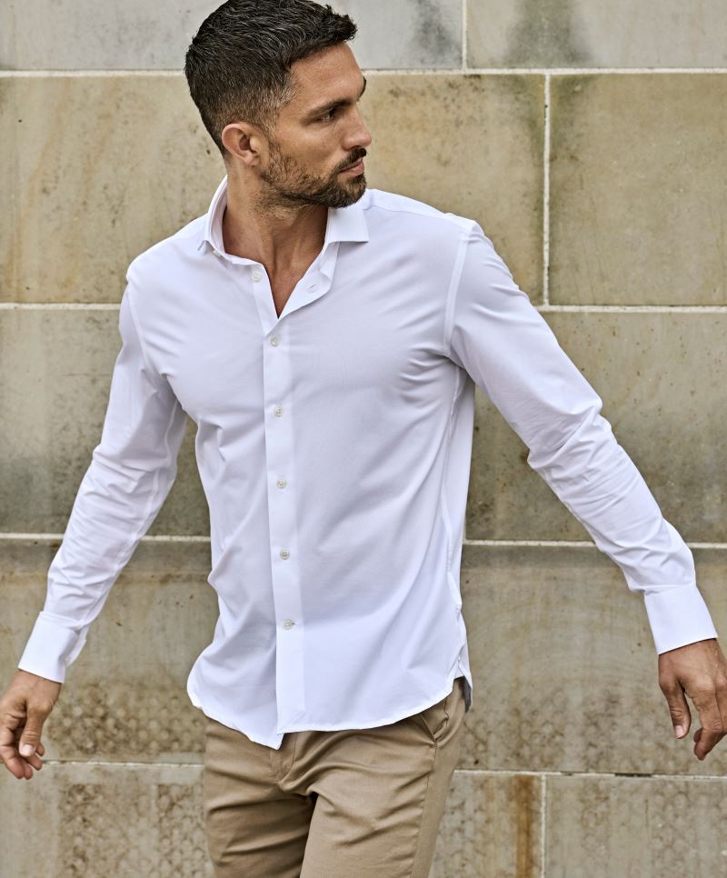 Taillierter Schnitt, herausnehmbare Kragenstäbchen, Kentkragen, doppellagige Schulter- und Rückenpasse, abgerundeter Saum, verstellbare Manschetten, Knöpfe Ton-in-Ton, 30° waschbar, Easy Care, Schonwäsche, nicht trocknergeeignet