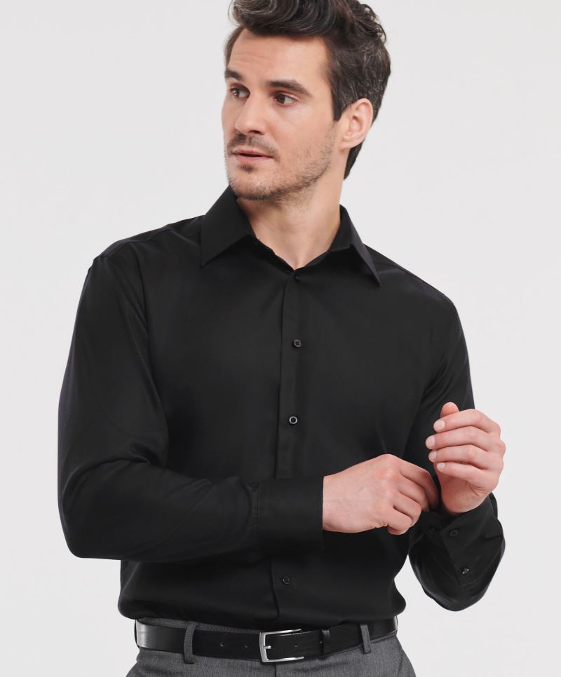 Italienischer Kragen mit einem Knopf, 7er Knopfleiste, abgerundete, mit 2 Knöpfen verstellbare Manschetten, Tear Away Label, neutrales Grössenlabel, 40° waschbar, bügelfrei, trocknergeeignet bei niedriger Temperatur