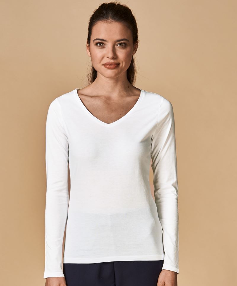 Schmaler Schnitt, schmal eingefasster V-Ausschnitt, neutrales Grössenlabel, 40° waschbar, nicht trocknergeeignet