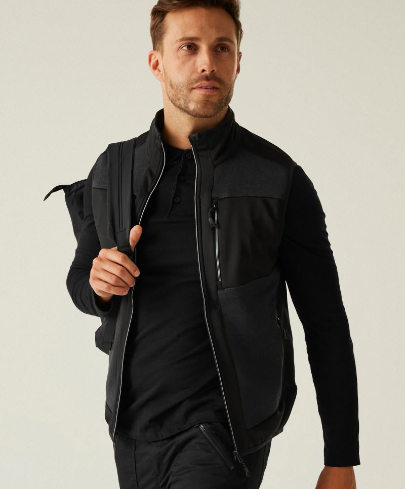 96% Polyester, enthält mindestens 50% recyceltes Polyester (rPet), 4% Elasthan, Softshell gewebt
