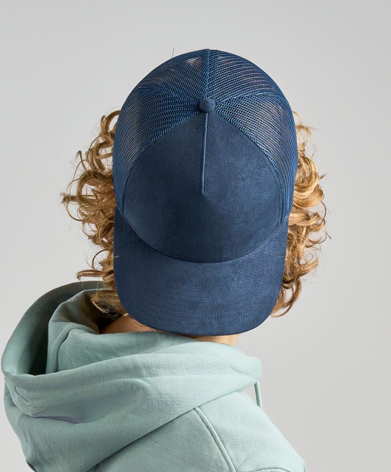 Renewed sustainable model Rapper Suede-S (article: 33.0261), curved visor, 8 decorative seams on the peak, mesh on the sides and back, cotton sweatband, structured front segment, snap closure, imitation suede, TearAway label, hand wash, not suitable for tumble drying, do not dry clean
