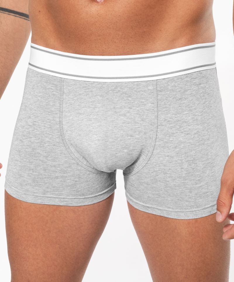 Fitted boxer style with longer leg, front fly keyhole opening, embossed wide elastic band