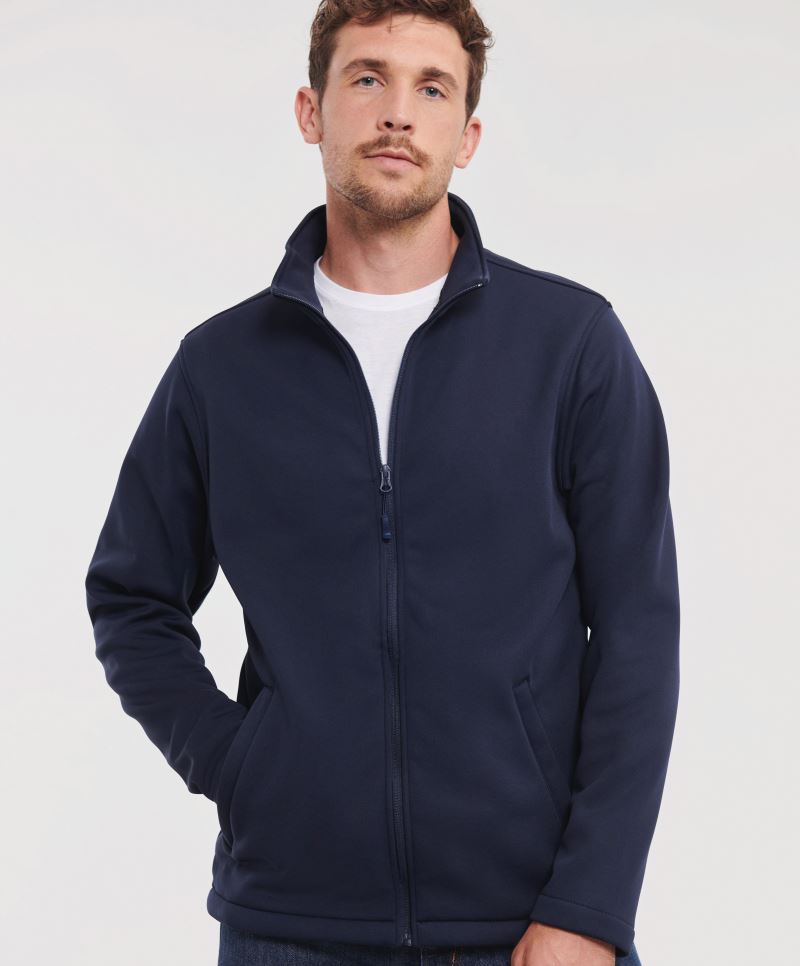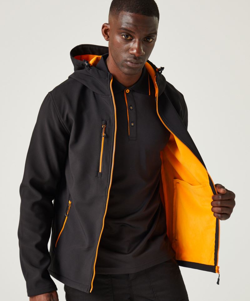 Water and dirt repellent, capped hood with width regulation, elastic hem and elastic cuffs, YKK zips, patch kangaroo pocket with zip, 1 inner pocket, 2-layer softshell fabric with contrasting color in mesh look, 30° washable, gentle wash, do not iron, not suitable for tumble drying
