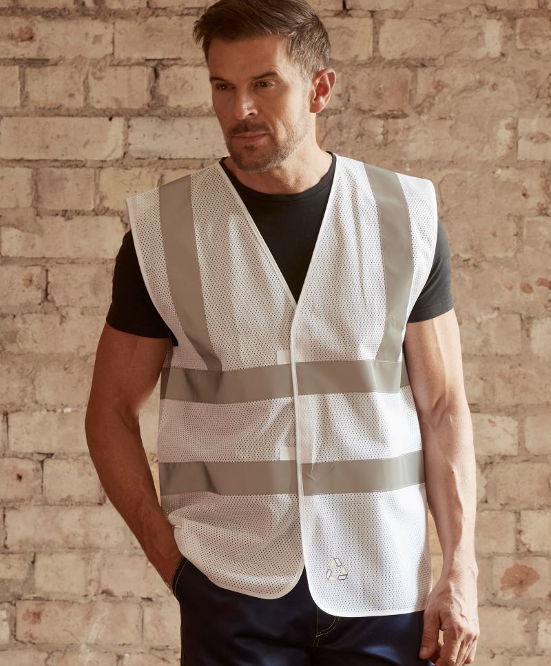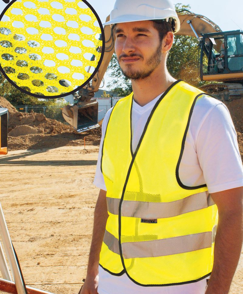 Very breathable, lined with black polyester edging, adjustable size with 2 velcro fasteners, perfect for hot work environments, certified according to EN 17353 type B3 (darkness), two 5 cm wide reflective strips around the body (without protective function)