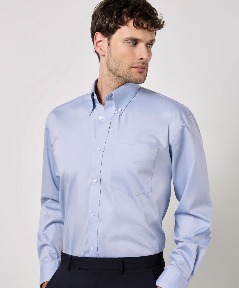 Classic cut, reinforced button down collar, optionally portable with cufflinks, cuffs with 1 button, rounded hem, buttons tone-in-tone, replacement buttons, left chest pocket, double seams on shoulders, armholes, sleeves and side seams, back folds on back yoke, 40° washable, easy iron, not suitable for tumble drying, sizes 18.5-23 art.no. 43.105X