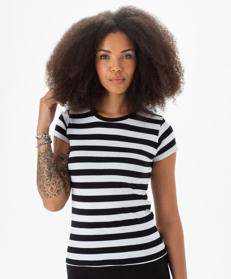 Narrow round neckline in rib knit, reinforced necktape, double stitching on sleeves and hem, yarn dyed stripes, TearAway label, neutral size label, 40° washable, not suitable for tumble drying, do not dry clean