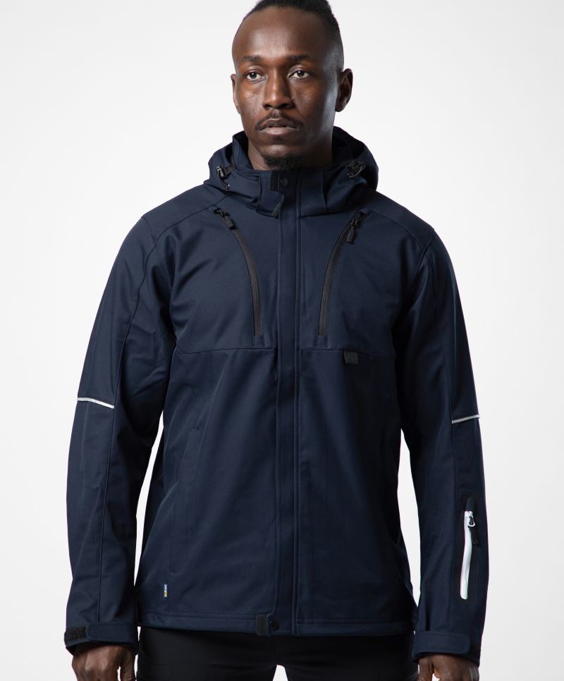Water repellent (8,000mm water column), breathable (8,000g/m² in 24h) and wind repellent, stand-up collar with soft fleece inside, detachable adjustable hood, ventilation zippers under the arms, drawstring on hem, adjustable cuffs with velcro fastener, ID pocket, 2 side pockets with zip, 2 breast pockets with zip, cell phone pocket in left breast pocket, ergonomically extended back, opening for headphones in the left inside pocket, reflective details, 40° washable, not suitable for tumble drying