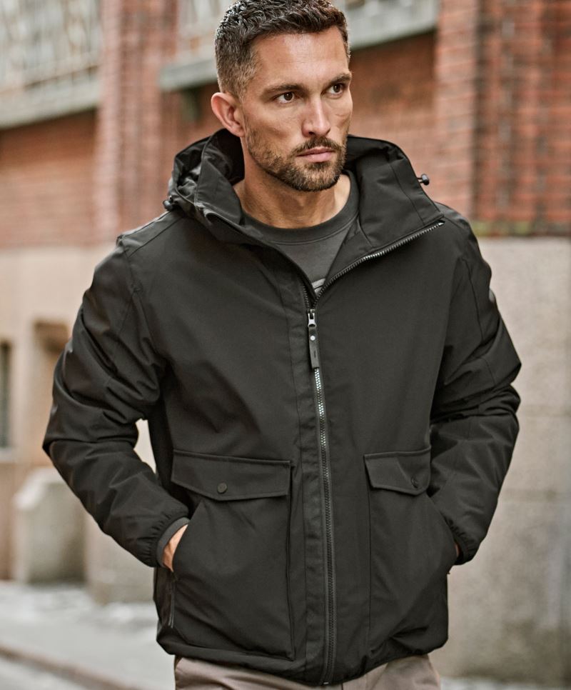 2-layer softshell fabric, water repellent, hood with drawcord, adjustable waistband with elastic cord, nylon zippers, 2 side pockets with zip, ergonomically extended back, TearAway label, 40° washable, not suitable for tumble drying