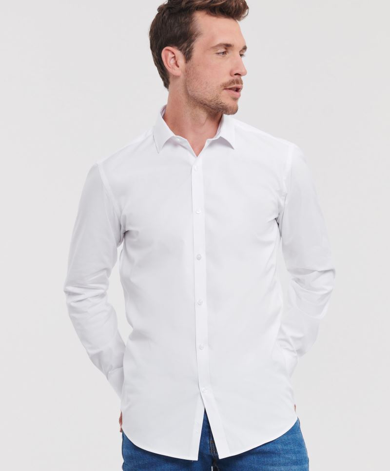 Tailored fit, button under collar, rounded hem, darts on the back, back yoke, easy care, easy iron