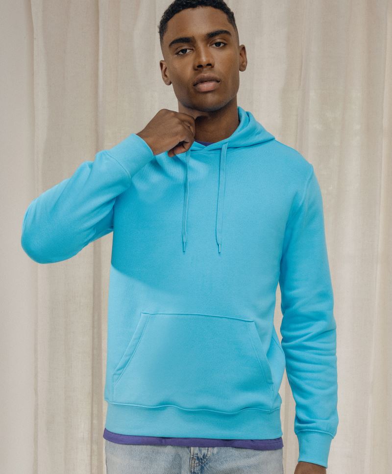 Generous cut, lined hood with flat cord tone-in-tone, halfmoon in neck, cuffs and hem with elastane, kangaroo pocket, double dyed, 3-thread sweat quality, brushed inside, neutral size label, 60° washable, not suitable for tumble drying