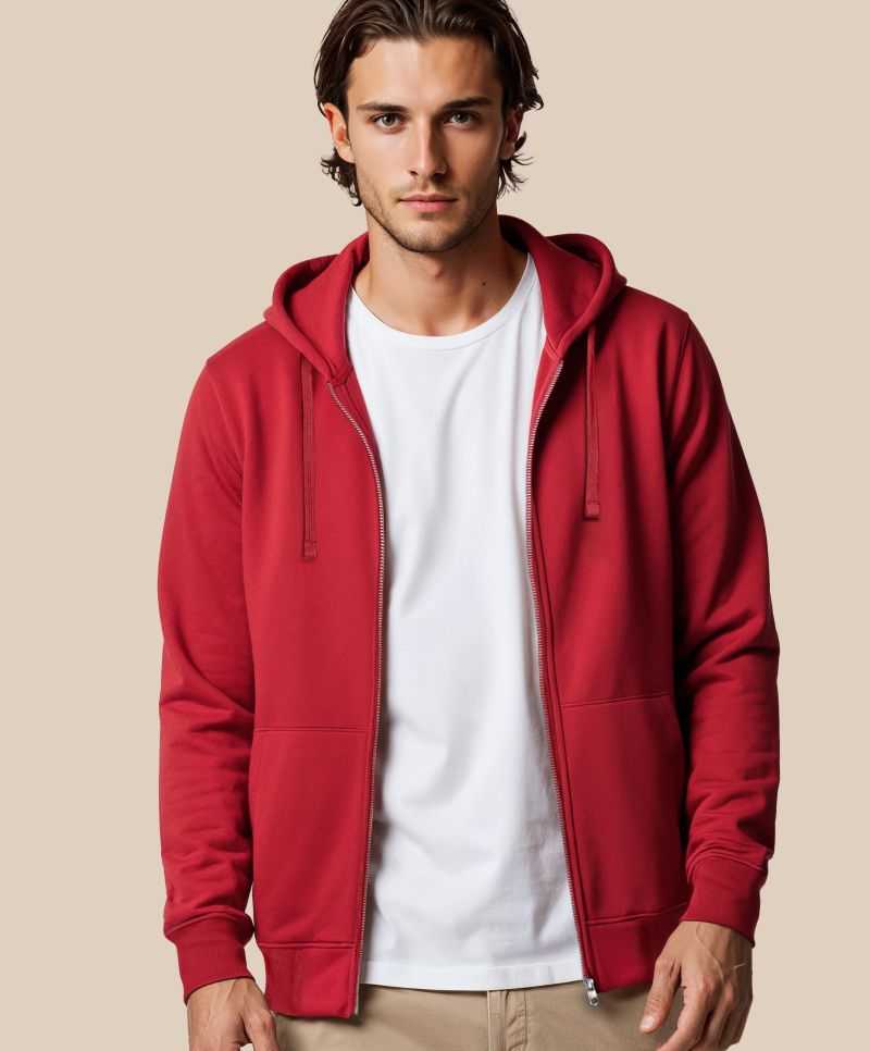 Generous cut, lined hood with flat cord tone-in-tone, halfmoon in neck, cuffs and hem with elastane, SBS zipper, kangaroo pockets, double dyed, brushed inside, neutral size label, 40° washable, not suitable for tumble drying