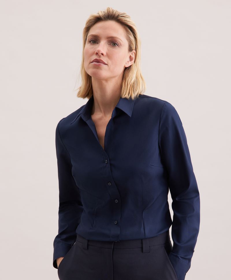 Vestibilità sfiancata, colletto piccolo morbido, carré a doppio strato su spalle e schiena, orlo arrotondato, bottoni tono su tono, cuciture alla viennese, lavabile a 30°, Easy Care, biancheria delicata, non adatta all'asciugatrice