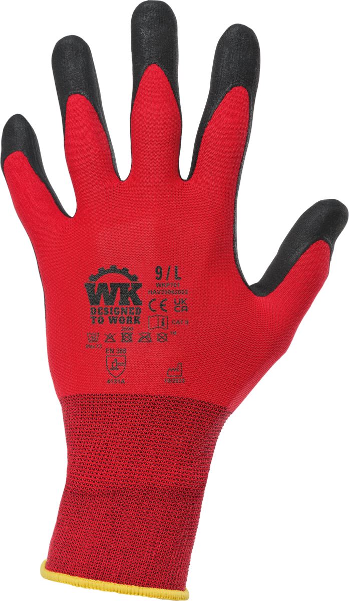 Bordini a maglia sulla manica, area rinforzata tra pollice e indice, certificato secondo la norma EN ISO 21.420 e 388, colori diversi a seconda della taglia dei guanti, lavabile a 40°
