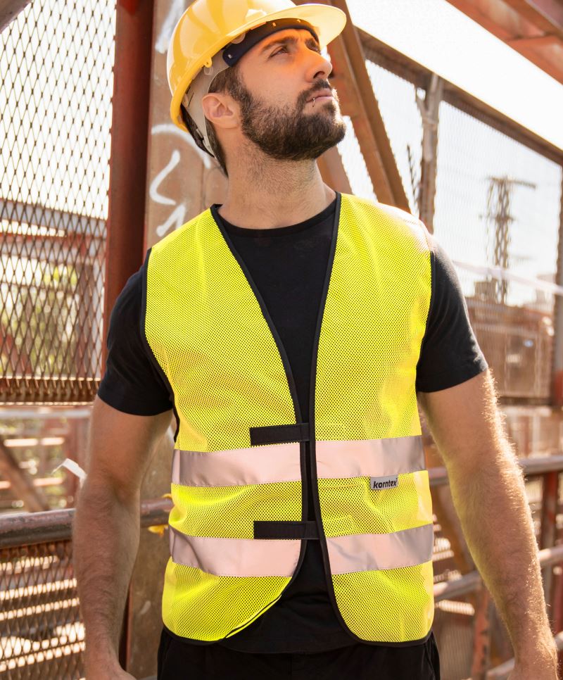 Molto traspirante, orlato con orlatura in poliestere nera, regolazione della grandezza tramite 2 chiusure a strappo, ideale per i luoghi di lavoro caldi, certificato secondo EN 17353 tipo B3 (buio), strisce riflettenti larghe due 5 cm attorno al corpo (senza funzione protettiva)