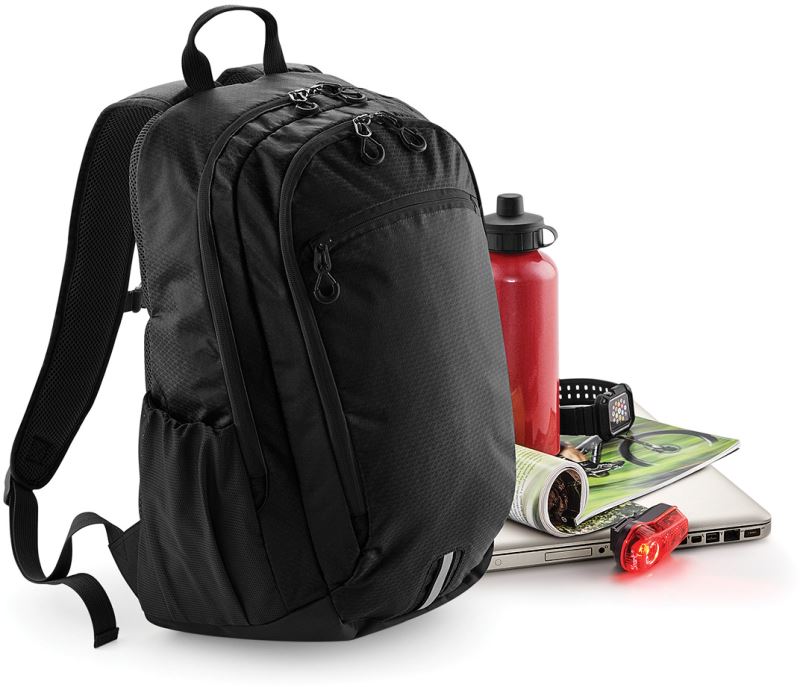 Cerniera bidirezionale, 2 tasche laterali con cordone e stopper, 2 tasche anteriori con cerniera lampo, cinghia portabagagli posteriore, scomparto interno con cerniera, scomparto per laptop con imbottitura adatto a laptop fino a 16", etichetta Tear Away, capienza: 22 l, dimensioni: 44x29x13 cm, pulire solo con una spugna, no Stiro, non adatta all'asciugatrice, non lavare a secco