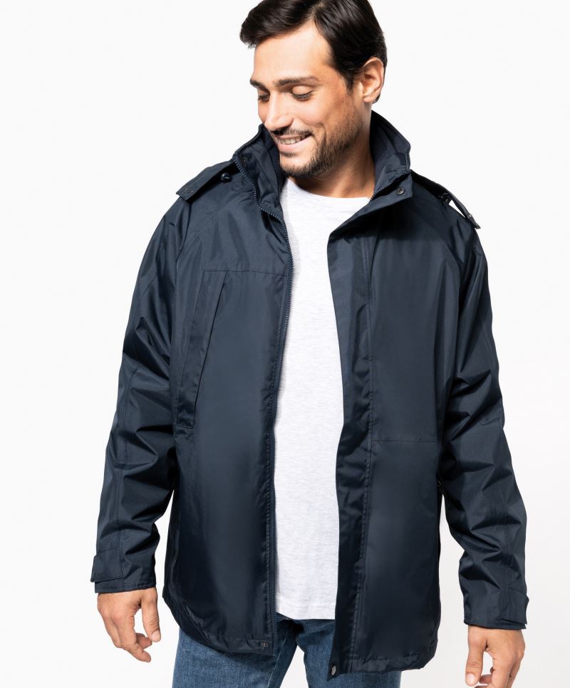 Giacca esterna: impermeabile (colonna d'acqua di 3.000 mm), traspirante (3.000 g/m² in 24h), antivento, colletto alla coreana imbottito, cappuccio estraibile imbottito con pistagna riflettente (senza funzione protettiva), polsini elastici con velcro, orlo regolabile, cerniera lampo bidirezionale con pannello antivento e chiusura a strappo, tasche laterali e tasca pettorale con cerniera lampo, cuciture incollate, conforme alla norma EN343 per la protezione dalla pioggia, giacca interna: materiale softshell a 2 strati, idrorepellente, traspirante, 1 tasca interna, tasche laterali, accesso di finitura, antivento, materiale softshell adatto alla stampa, lavabile a 30°, no Stiro, non adatta all'asciugatrice