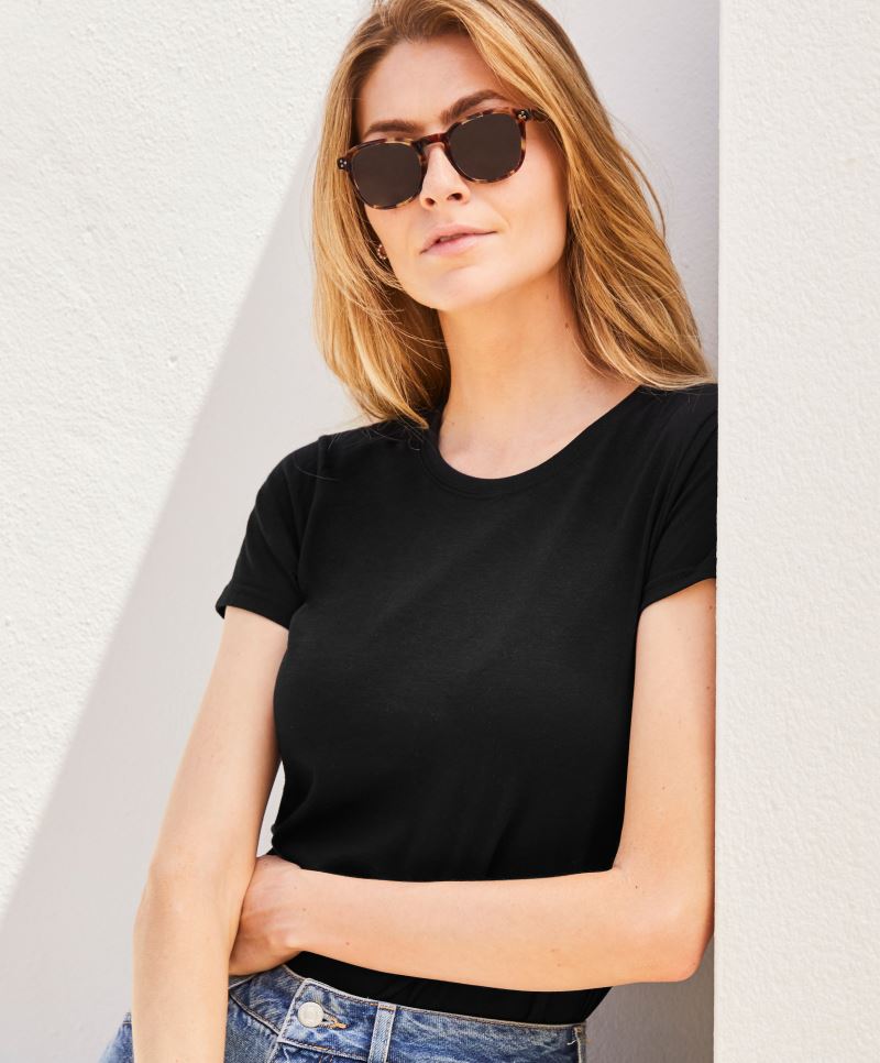 Taglio femminile, scollatura a collo rotondo in maglia a coste con trapuntatura 1x1, fascia del colletto e delle spalle continua, etichetta Tear Away, lavabile a 40°, adatta all'asciugatrice a temperatura bassa