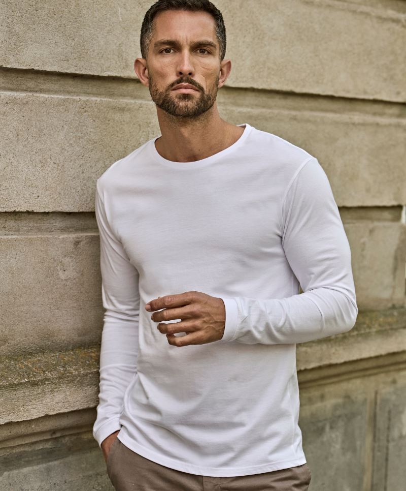 Articolo in maglieria tubolare, scollatura a maglia a coste con elastan, bordino al collo, etichetta Tear Away, lavabile a 40°, non adatta all'asciugatrice